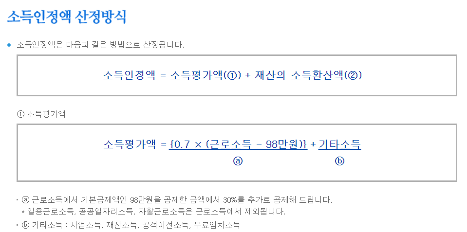 그럼 소득인정액 산정방법에 대해 아셔야할텐데요, 이 계산수식은 아래 사진을 참고해주시면 됩니다.