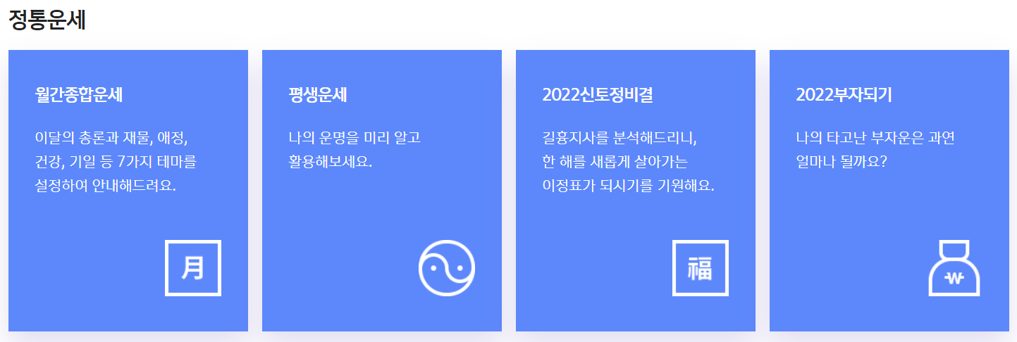 월간종합운세, 평생운세, 2022년 신토정비결, 2022년 부자운 등 기본적인 것들을 보실 수 있죠.