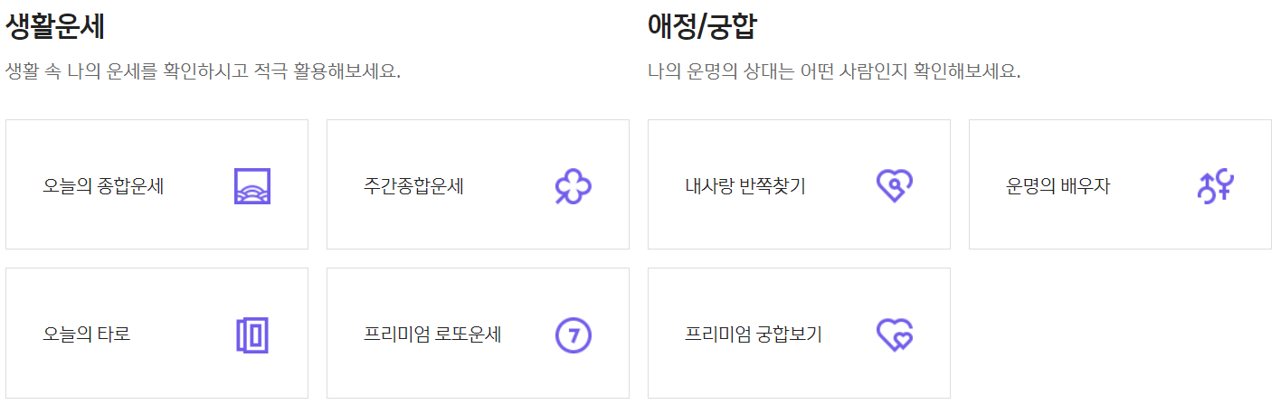 그밖에도 생활운세와 애정, 궁합도 보실 수 있는데 프리미엄 궁합이나 프리미엄 로또운세는 유료서비스일 것 같은 이름이지만 무료로 가능하니 참고하세요!