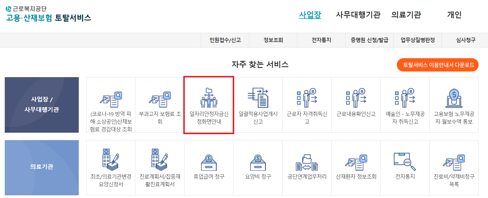 - 온라인 신청 : 고용&산재 토탈서비스 홈페이지에서 신청하실 수 있습니다.