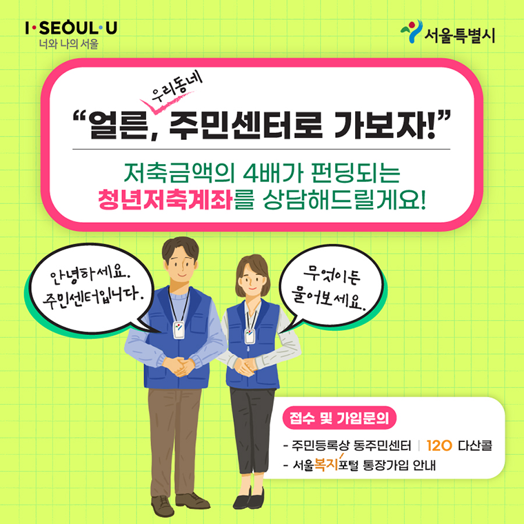 청년저축계좌를 신청하기 위해 주민센터에 방문하실 때는 근로활동이나 사업활동을 증빙할 수 있는 서류를 챙겨가셔야 하니 잊지 마세요!