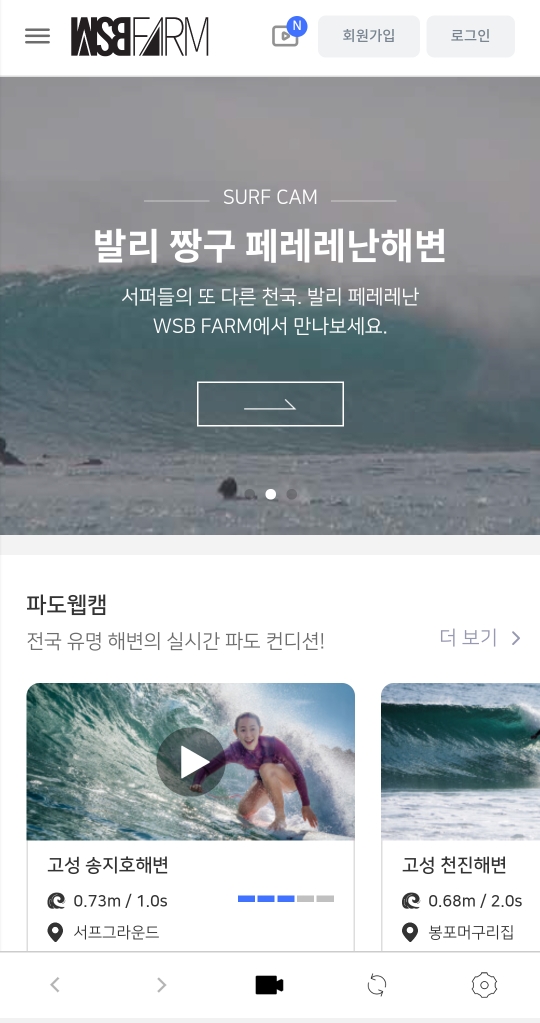 WSB Farm에서는 해수욕장 파도를 실시간으로 보여주는 파도웹캠과 서핑레슨, 서핑관련 컨텐츠, 서핑이야기가 담긴 매거진, 서핑 스폿 가이드 등을 소개하고 있어요.