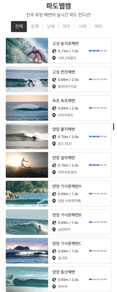 앱에 들어가면 요렇게 화면이 뜨는데, 파도웹캠을 누르고 들어가면 전국 유명 해변의 실시간 파도 컨디션을 눈으로 직접 확인할 수 있어요.