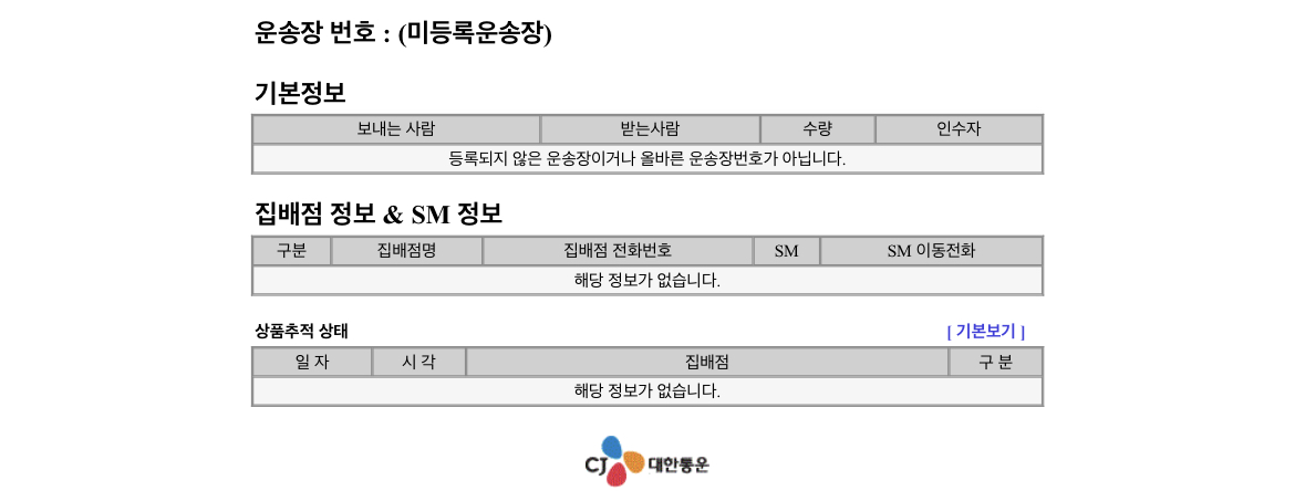 그럼 이렇게 바로 CJ대한통운 택배 상세조회가 가능합니다. 저는 예시로 보여들기 위해 운송장 번호를 넣지 않았기 때문에 미등록 운송장이라고 뜨는 것인데 정상적인 운송장 번호를 넣으시면 택배가 어디쯤 오고 있는지 바로 조회가 가능합니다!